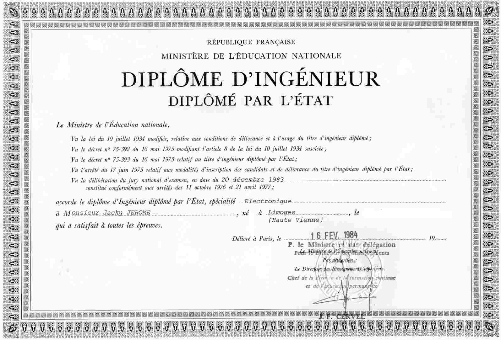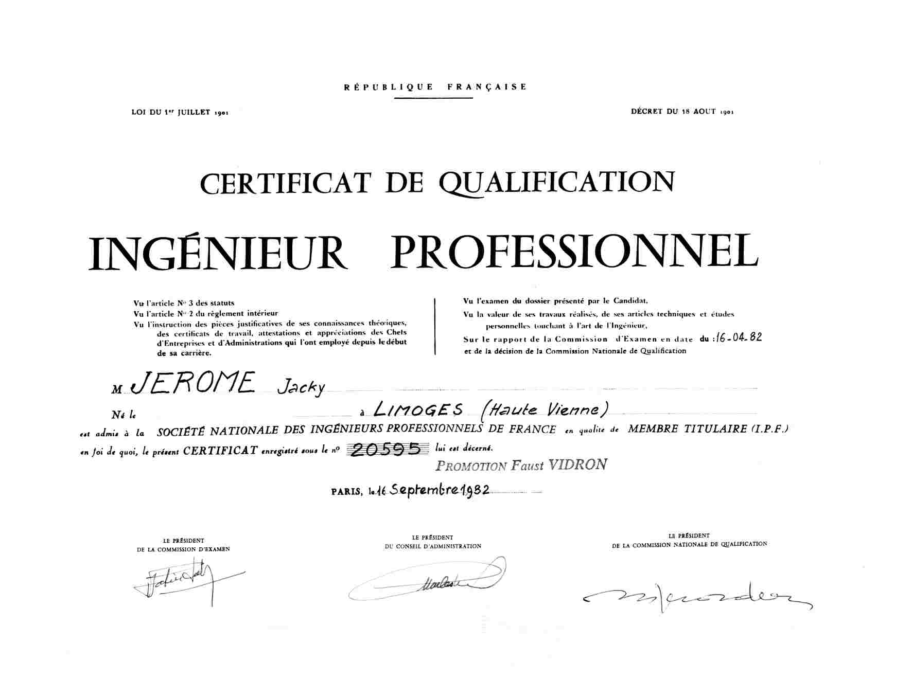 Certificat de formation d'ingénieur électronicien délivré par l'Institut Technique Professionnel - Ecole des Cadres de l'Industrie.